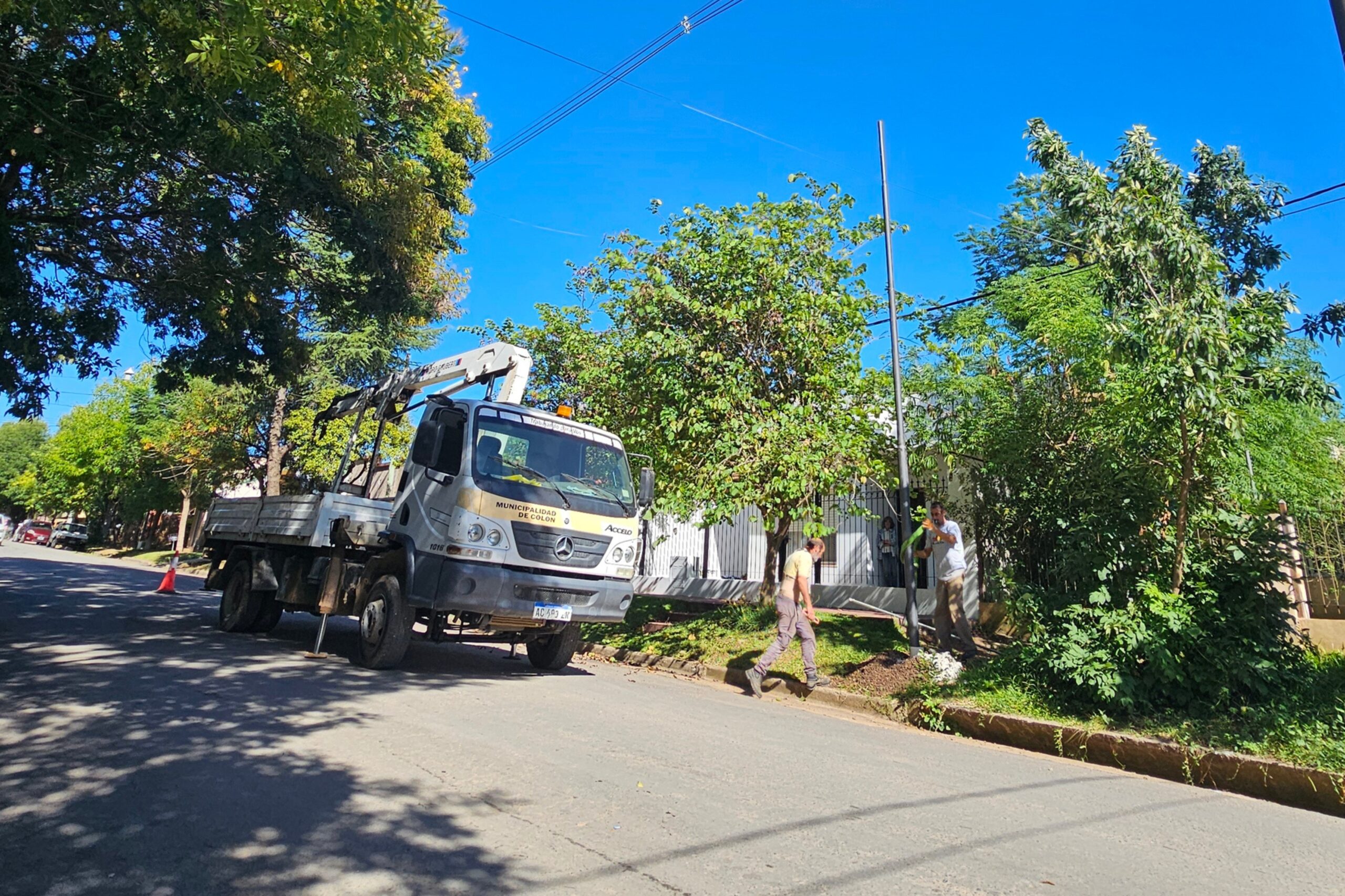 La Municipalidad de Colón, a través del Área de Electrotecnia, continúa ejecutando obras de mejora en la infraestructura urbana con la colocación de nuevas columnas de alumbrado público sobre calle Alberdi, en el marco del plan de modernización del sistema lumínico de la ciudad.