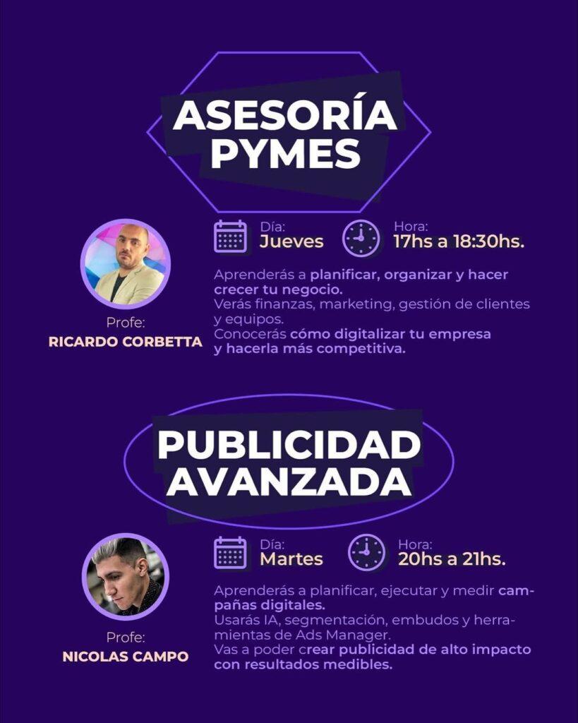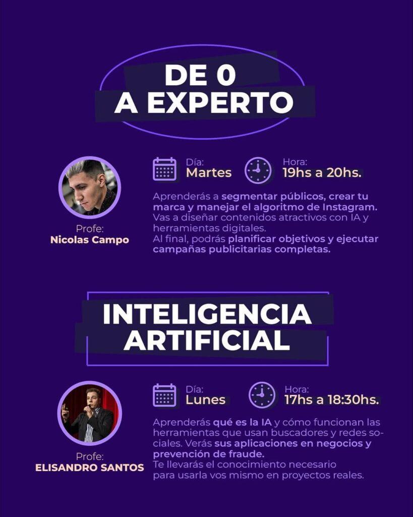 - De 0 a experto (Instagram + IA aplicada) – Martes, 19:00 a 20:00 (Prof. Nicolás Campo).