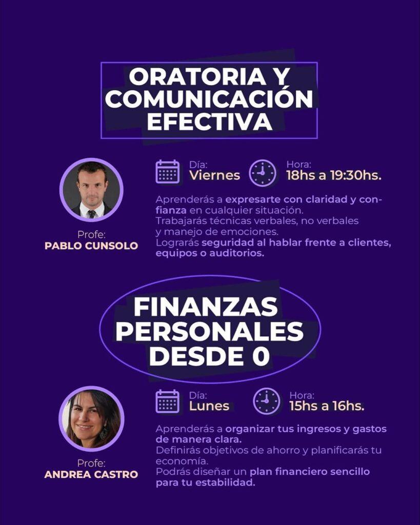 - Finanzas personales desde cero – Lunes, 15:00 a 16:00 (Prof. Andrea Castro).