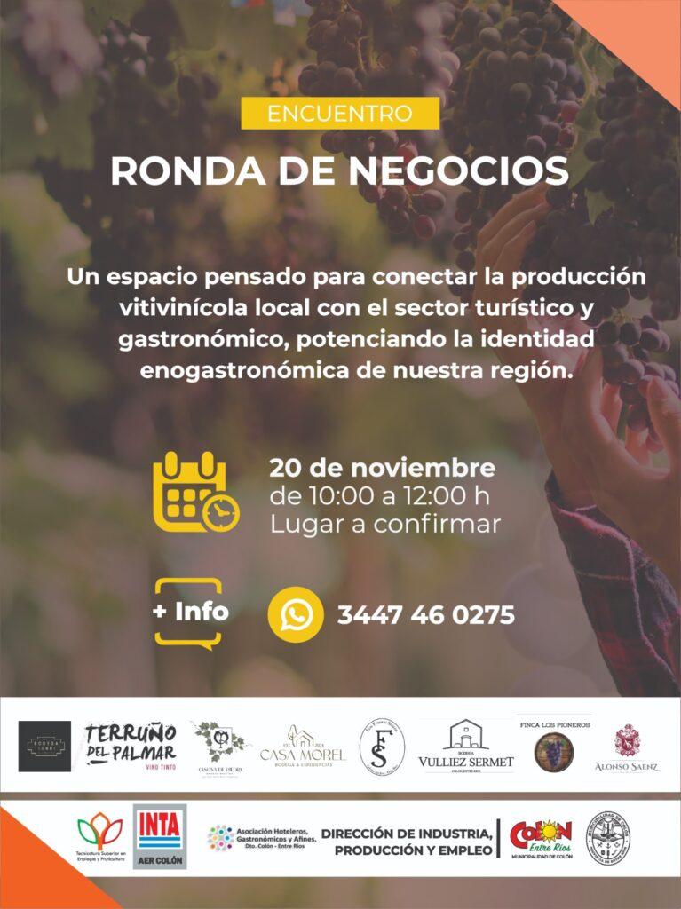 El jueves 20 de noviembre, de 10:00 a 12:00, la Municipalidad de Colón llevará adelante una Ronda de Negocios orientada a conectar la producción vitivinícola local con el sector turístico y gastronómico. La propuesta incluye presentaciones breves de bodegas, degustaciones técnicas y un espacio de networking profesional para impulsar acuerdos de comercialización, cartas de vinos y experiencias enoturísticas.