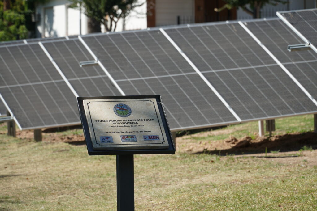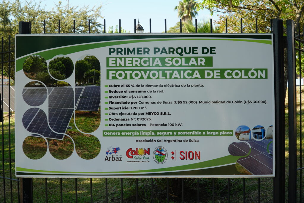 El acto incluyó una oración a cargo del pastor Tito Kuliat y la bendición de las instalaciones por parte del sacerdote Rubén Dalzotto. Posteriormente, se llevó a cabo el descubrimiento de una placa conmemorativa que deja testimonio de la puesta en marcha del primer parque solar de la ciudad, financiado con aportes de comunas de Suiza y de la Municipalidad de Colón.