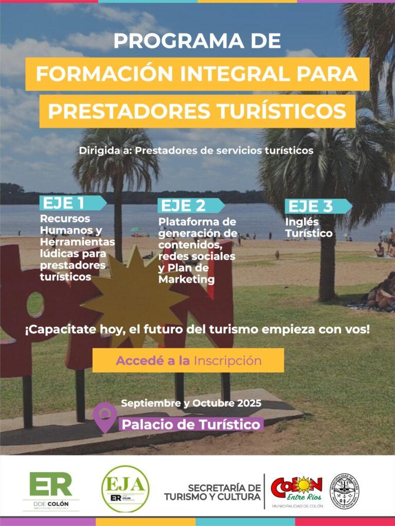 La Secretaría de Turismo y Cultura de la Municipalidad de Colón abre la inscripción al “Programa de Formación Integral para Prestadores Turísticos”, una propuesta diseñada para fortalecer capacidades y estándares de calidad en la atención al visitante. La iniciativa se desarrollará durante septiembre y octubre en el Palacio de Turismo, con módulos orientados a recursos humanos, comunicación digital/marketing e inglés aplicado al turismo.