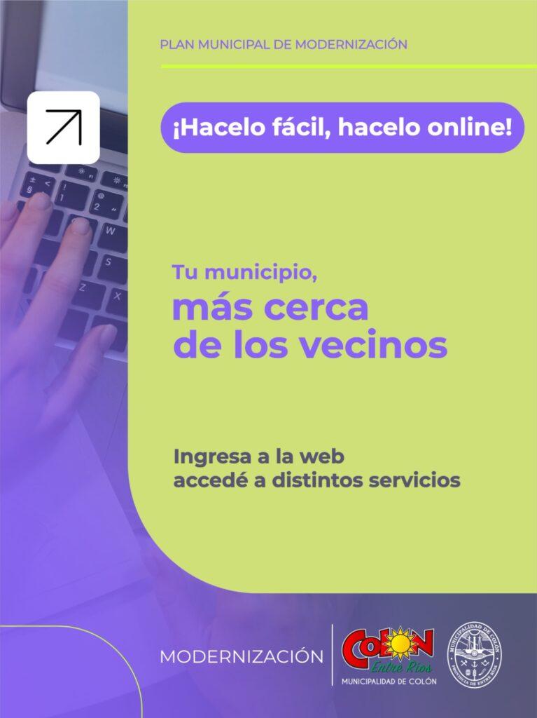 El Municipio de Colón informó que, en el marco del Plan Municipal de Modernización, se ampliaron y optimizaron los servicios disponibles en el Portal Tributario www.rentascolon.gob.ar. La plataforma permite registrarse una sola vez con el número de inmueble y comenzar a operar en línea, reduciendo tiempos, costos y uso de papel.