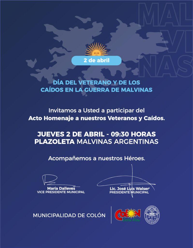 La Municipalidad de Colón llevará a cabo este jueves 2 de abril un acto en homenaje a los Veteranos y Caídos en la Guerra de Malvinas, en el marco del Día del Veterano y de los Caídos en la Guerra de Malvinas. La ceremonia tendrá lugar a las 9:30 en la Plazoleta Malvinas Argentinas.