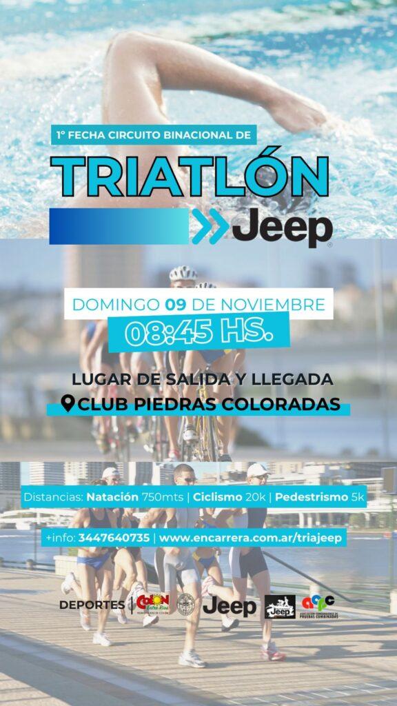Este domingo 09 de noviembre, a las 08:45, se disputará en Colón la primera fecha del Circuito Binacional de Triatlón “Jeep”, con largada y llegada en el Club Piedras Coloradas. La prueba combinará 750 metros de natación, 20 kilómetros de ciclismo y 5 kilómetros de pedestrismo.
