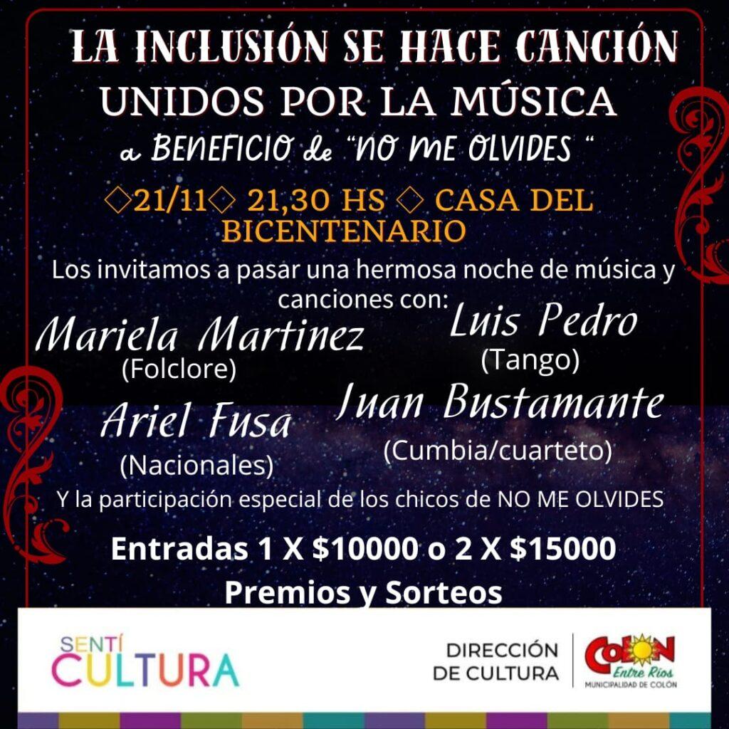 Una noche solidaria a beneficio de No Me Olvides, con presentaciones de Mariela Martínez, Luis Pedro, Ariel Fusa y Juan Bustamante, además de la participación especial de los chicos de la institución. Música, emoción y comunidad en la Casa del Bicentenario desde las 21:30.
