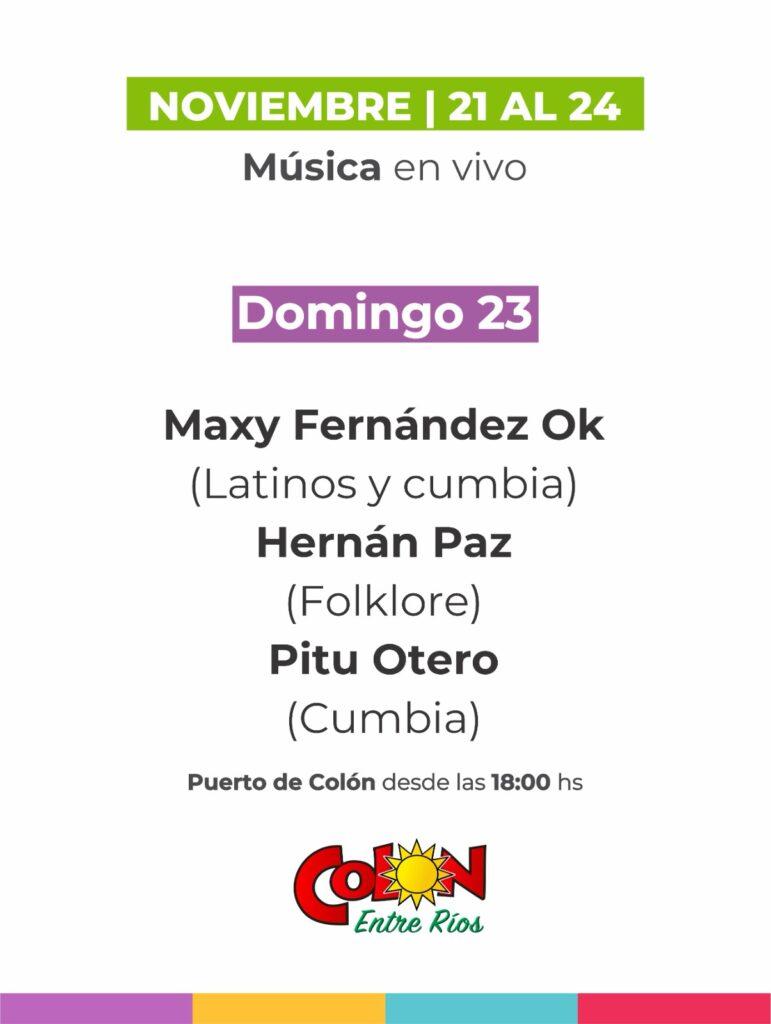 Mientras que el domingo 23, se presentarán Maxy Fernández OK, Hernán Paz y Pitu Otero.
