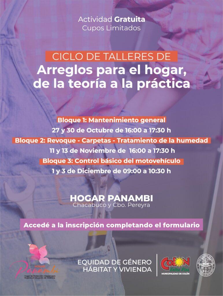 La Municipalidad de Colón, a través de las áreas de Equidad de Género y de Hábitat y Vivienda, invita al nuevo ciclo de talleres prácticos orientados a resolver tareas cotidianas del hogar y a promover la autonomía en el mantenimiento doméstico, con enfoque participativo e inclusivo.