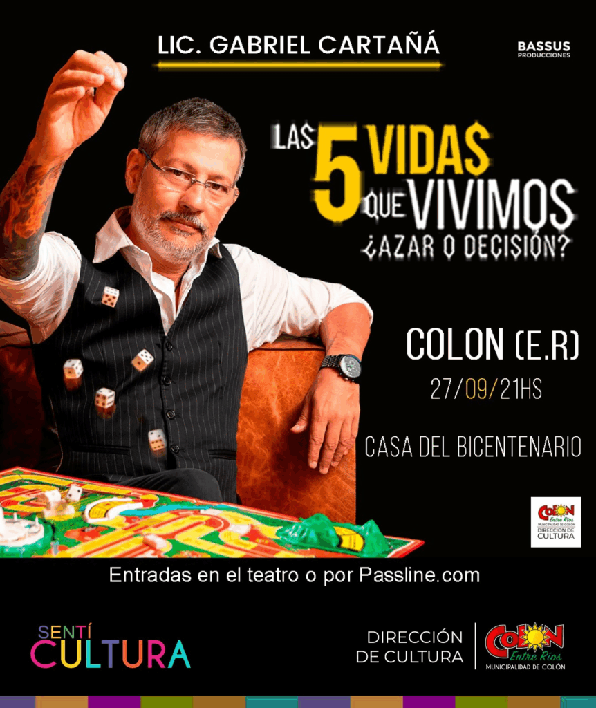 Con una propuesta que combina reflexión, humor y participación del público, Gabriel Cartañá llega a Colón con su charla–espectáculo “Las 5 vidas que vivimos”, una invitación a explorar las distintas etapas, roles y decisiones que nos atraviesan. El formato, ya presentado con gran convocatoria en otras ciudades, propone un recorrido claro y cercano para comprender qué lugar ocupa cada “vida” y cómo mejorar el presente.