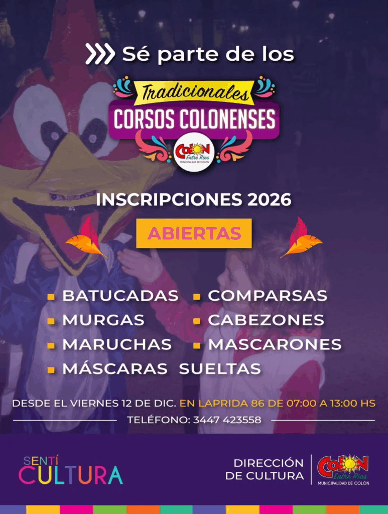 La Municipalidad de Colón, a través de la Dirección de Cultura, informa que se encuentran abiertas las inscripciones para participar de los Tradicionales Corsos Colonenses 2026, una de las celebraciones populares más representativas de la ciudad.