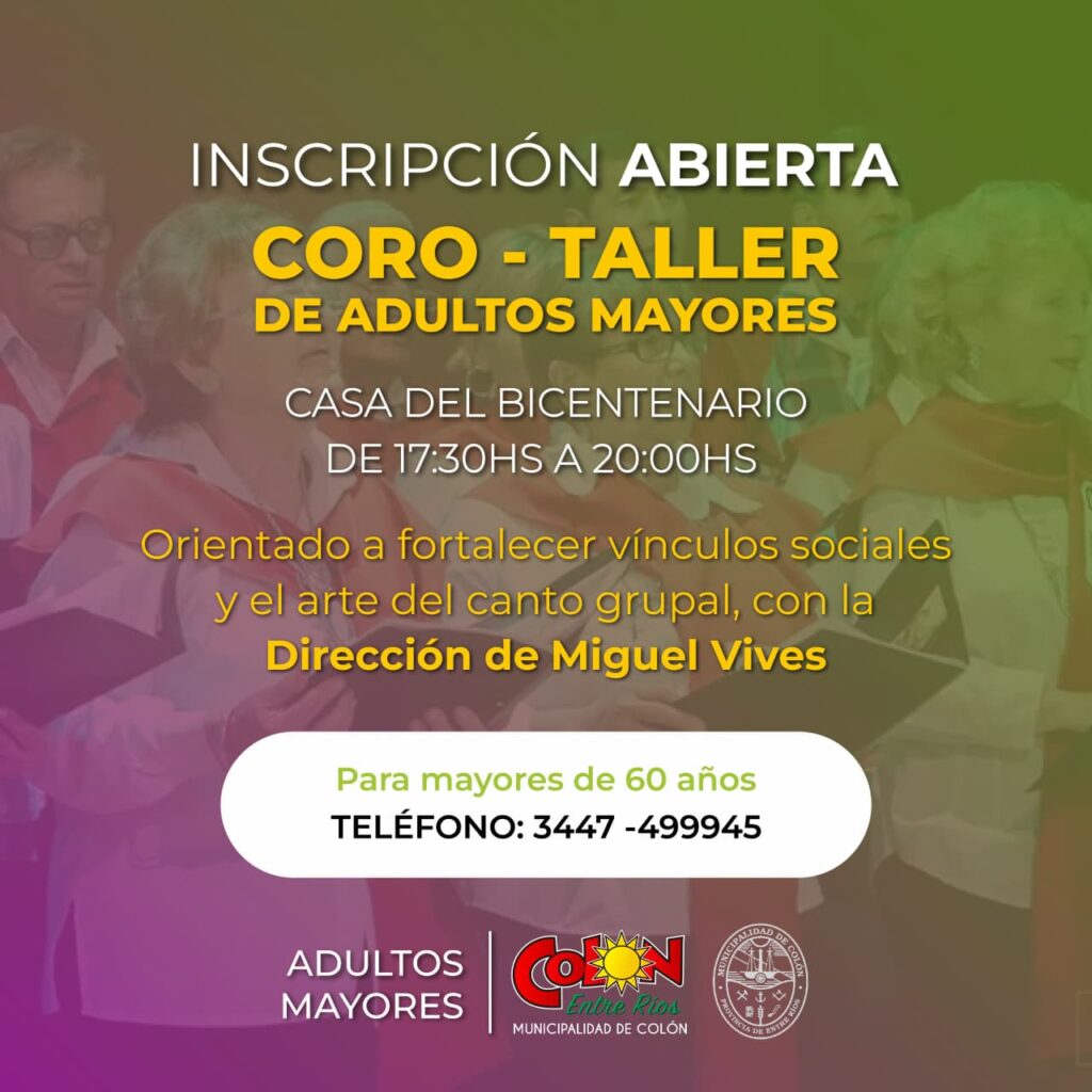 Bajo la dirección del profesor Miguel Vives, esta actividad se orienta a fortalecer los vínculos sociales a través del arte del canto grupal. Las clases se llevarán a cabo en la Casa del Bicentenario en el horario de 17:30 a 20:00 horas. Para inscribirse o realizar consultas, los interesados deben contactarse al número 3447-499945.