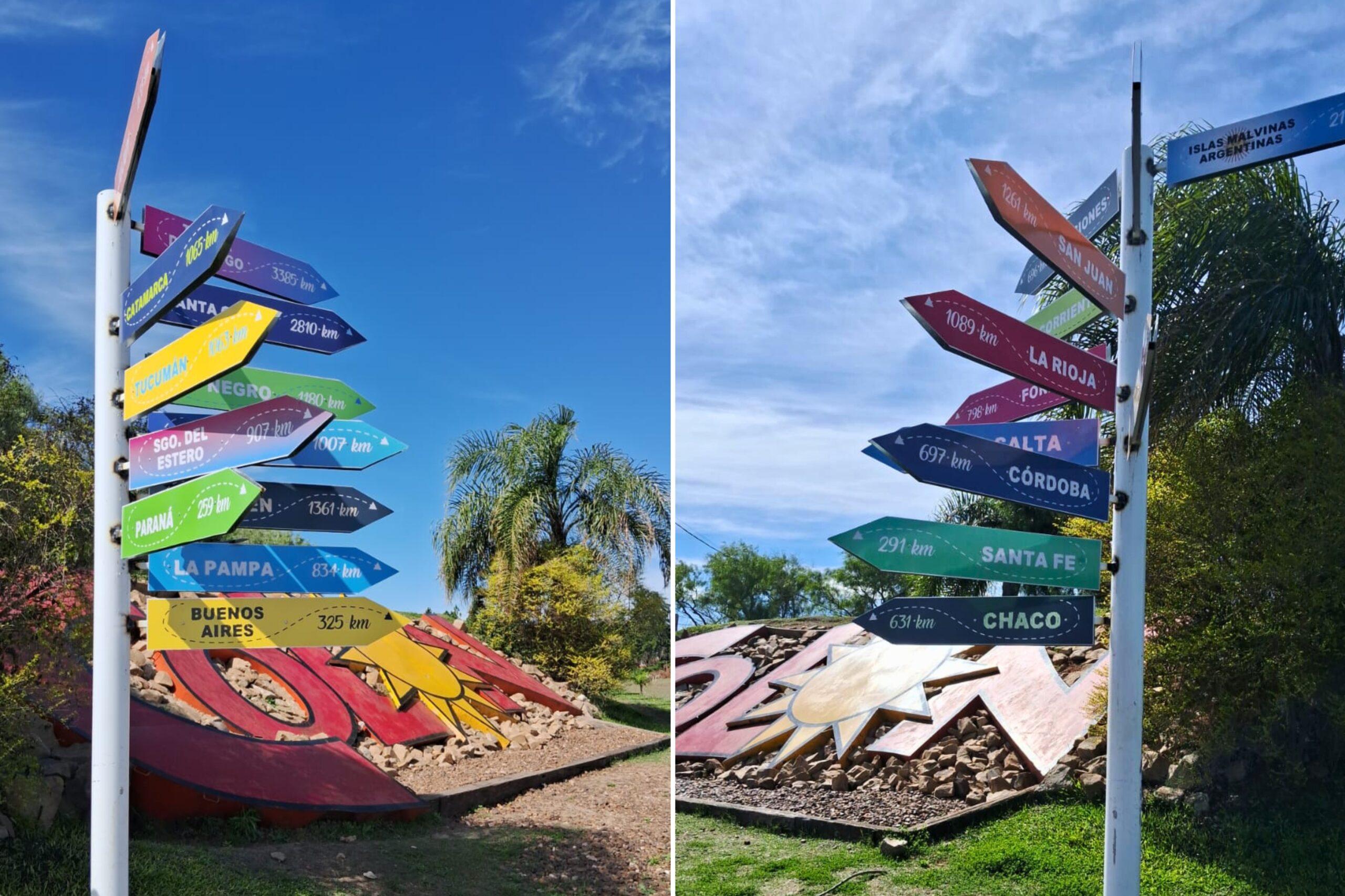 Las flechas incorporan referencias a múltiples destinos del país, reforzando el espíritu federal de Colón y su conexión con rutas turísticas regionales. La propuesta pone en valor a la ciudad como “puerta” de la Costa del Río Uruguay y punto de partida hacia experiencias termales, culturales y de naturaleza.