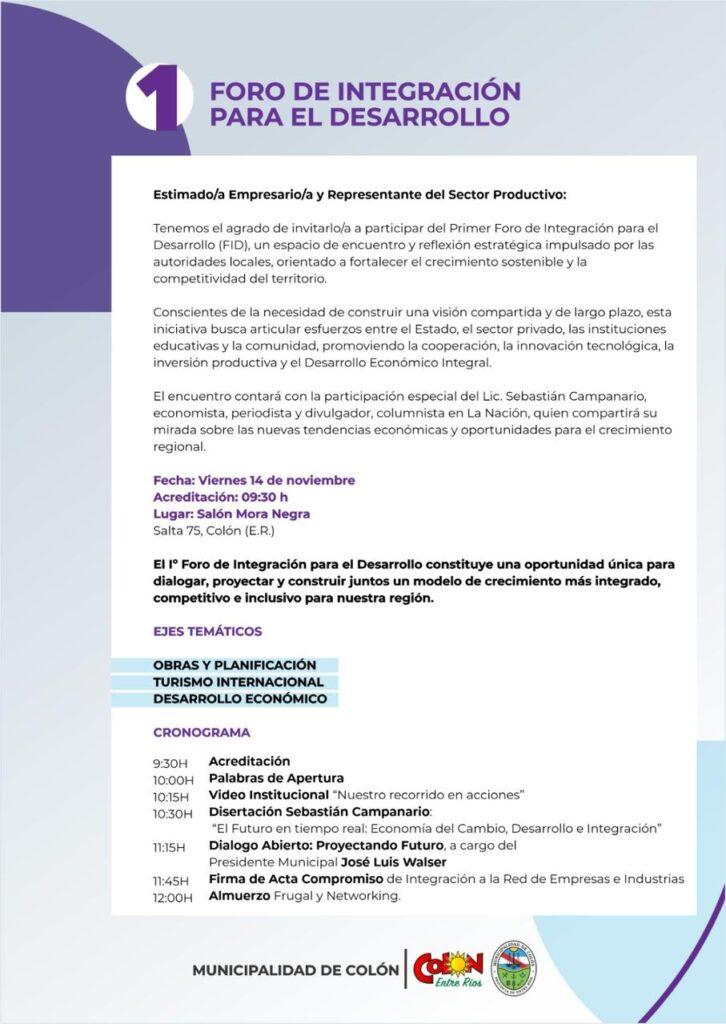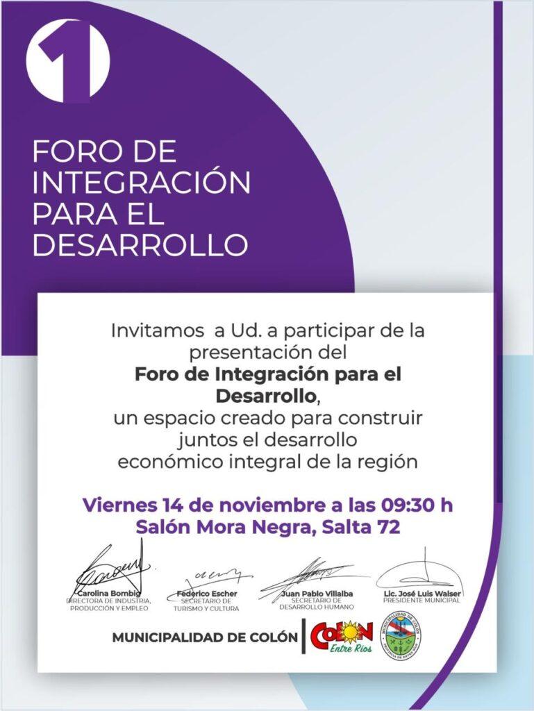 La Municipalidad de Colón, Entre Ríos, llevará a cabo el “Foro de Integración para el Desarrollo”, un evento que busca promover la integración y el desarrollo económico de la región, el próximo viernes 14 de noviembre a las 09:30 h en el Salón Mora Negra, ubicado en Salta 72.
