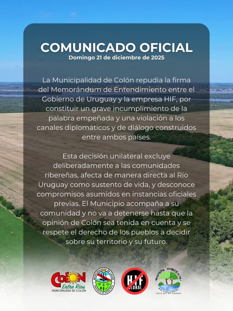 La Municipalidad de Colón expresa su enérgico repudio a la firma del Memorándum de Entendimiento entre el Gobierno de Uruguay y la empresa HIF Global, considerando que constituye un grave incumplimiento de la palabra empeñada y una violación a los canales diplomáticos y de diálogo construidos entre ambos países por el proyecto de instalación de una planta de combustibles sintéticos en la costa uruguaya de Paysandú, sobre el río Uruguay, frente a las playas colonenses.
